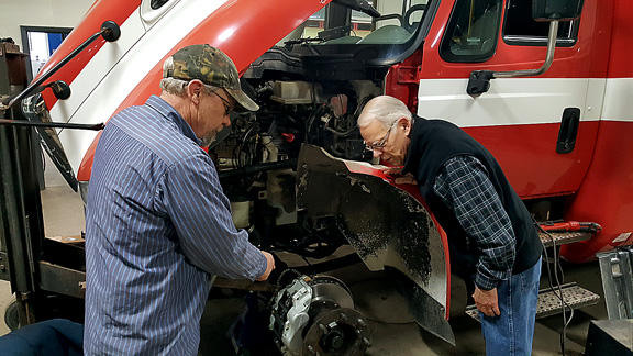 News Photo by Jason Ogden Prell’s Service owner Ron Prell, right, discusses a Thunder Bay Transportation Authority bus repair Tuesday with Maintenance Supervisor Larry Corum. Prell, who has been a third party contractor for city transportation since the 1970s, is scaling back business after the TBTA’s decision to no longer go with a third party operator.