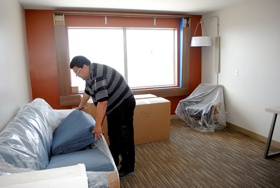 News Photo by Steve Schulwitz Holiday Inn and Suites General Manager Tony Sottile removes a cushion from a couch that is in one of the suites in the new hotel in Alpena. Sottile said the new business should open soon and the hiring and training process is set to begin.