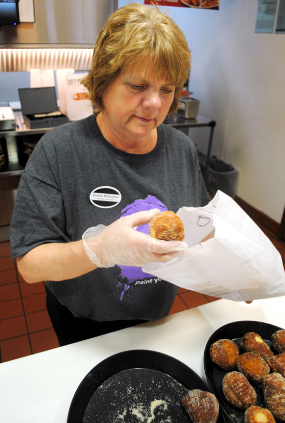 Arby’s Restaurant General Manager Bonnie McEachern loads bags with freshly baked paczki Tuesday morning during the restaurant’s annual fundraiser sale for Relay for Life. According to McEachern the restaurant makes about 120 of the traditional pastries eaten on the Tuesday before the Lenten season begins. Cooks begin the process at around 6 a.m. and the paczki are sold out in around an hour. She said they make about $1,200 from the charity sale.