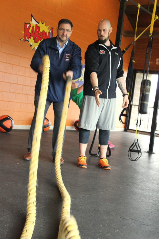 News Photo by Steve Schulwitz State Sen. Jim Stamas, left, tries a heavy rope workout while touring Performance Locker in Alpena Tuesday. Owner Casey Stutzman showed Stamas what his business offers customers and also shared thoughts and opinions on what government in Lansing can do to help small businesses.