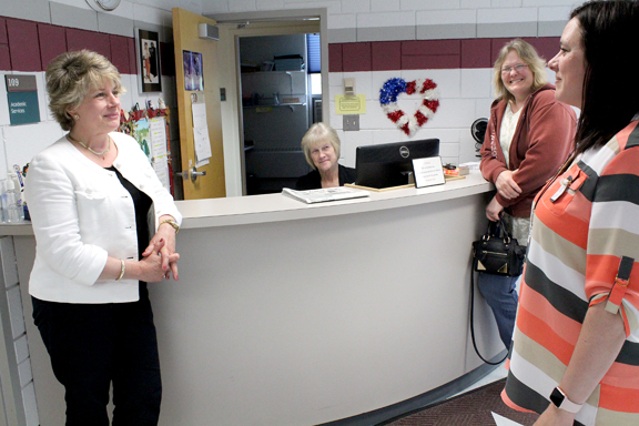 News Photo by Jordan Spence Nancy Seguin talks with fellow Alpena Community College co-workers.