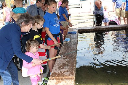 A group of children, with the aid of adults and teens, fish for brown trout in Culligan Plaza during the annual Alpena Optimist Club kids fishing day event.