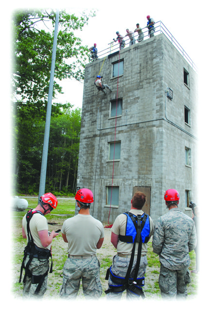 A group of American Air National Guard personnel and personnel from the Latvian Air Force work on firefighter training, in this case demonstrating how to repel with ropes from the side of a potentially burning building during a combat training exercise.