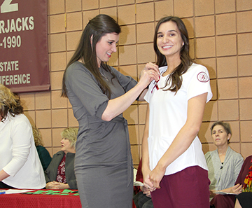 Alex Chmura, left, places a nursing pin on her sister, Alpena Community College registered nurse graduate Paige Chmura, during a ceremony on Wednesday. There were 18 licensed practical nurse graduates and five registered nurse graduates who were pinned.