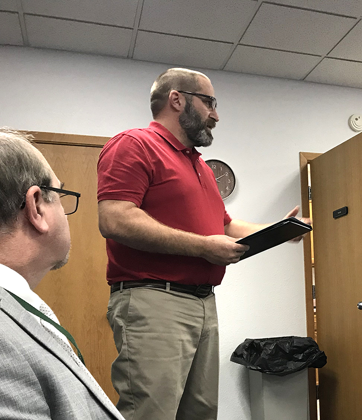 News Photo by Julie Goldberg Luke Gerhart of Wolgast Corp., standing, talks with the Alpena-Montmorency-Alcona Educational Service District Board of Education on Thursday about the board approving a contract with architectural firm OHM Advisorss for updates at Pied Piper School.