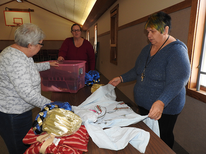 News Photo by Crystal Nelson Hillman residents Karen Funk, Lisa Stanley, and Lorie Jacobs look over costumes that will be used in a live Nativity Saturday in Emerick Park.