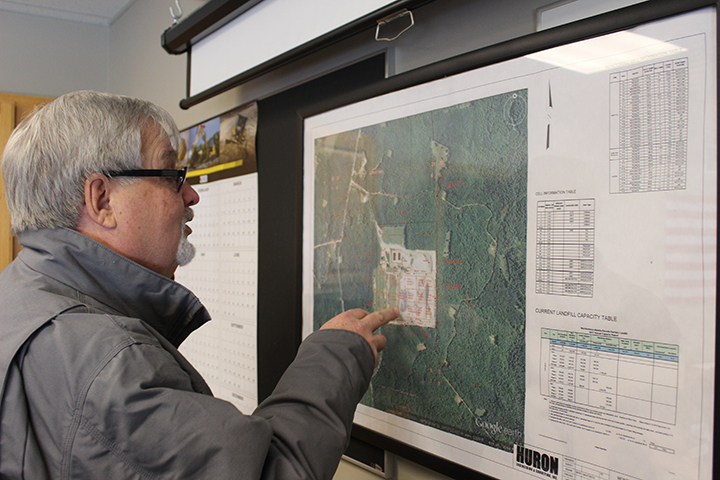 News Photo by Steve Schulwitz Alpena County Commissioner Bill Peterson points out on a map where the landfill in Atlanta was constructed. After several years of serious financial distress, the landfill has bounced back strong and is profitable.