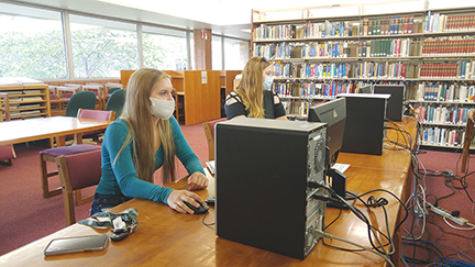 News Photo by Crystal Nelson Alpena Community College students Mary Burns and Megan Rasmussen on Monday work on the computers in the college library as classes resumed in-person for the first time since March.