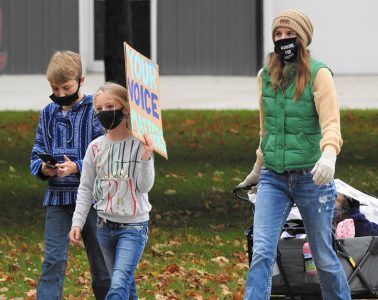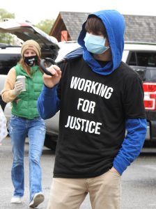 Holding aloft a sign, a walker sports a facemask promoting working for justice at the start of a march down an Alpena street on Sunday.