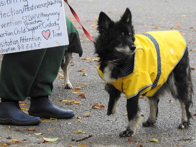 At the start of a Sunday afternoon walk in Alpena encouraging inclusion of everyone, a three-legged dog scans the crowd.