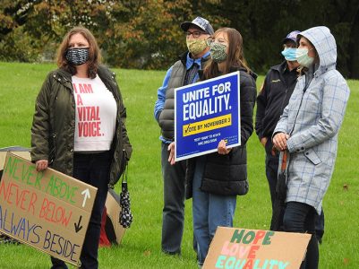 Silent walkers let signs do the talking at the conclusion of a march supporting equality from Duck Park to the Bay View park bandshell on Sunday.
