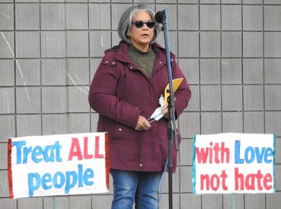 - News Photo by Julie Riddle Guest speaker Sandra Pigrim-Lewis, of Alpena, speaks to an audience about the tapestry of all people working together after a silent march for justice down a city street on Sunday.