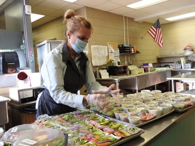 Trish Szatkowski, salad bar attendant at Alpena Public Schools, on Friday prepares salads at Alpena High School.