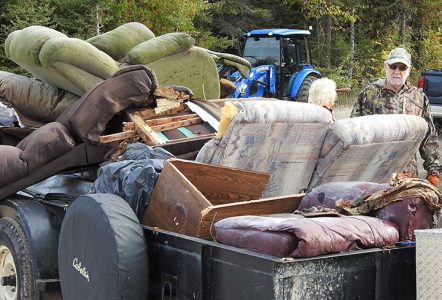 - News Photo by Julie Riddle Cleanup organizer Pat Gallagher looks at a trailer load of furniture hauled out of the woods along Hamilton Road north of Alpena on Saturday.