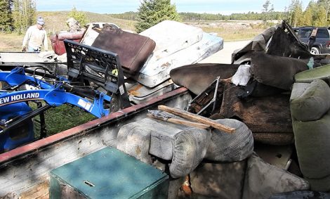 Cleanup organizer Pat Gallagher looks at a trailer load of furniture hauled out of the woods along Hamilton Road north of Alpena on Saturday.