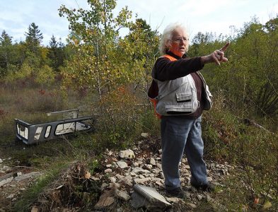 A discarded truck bed topper behind her, cleanup organizer Lois Hall points out other spots along Hamilton Road north of Alpena where refuse of all kinds has been found over the years.