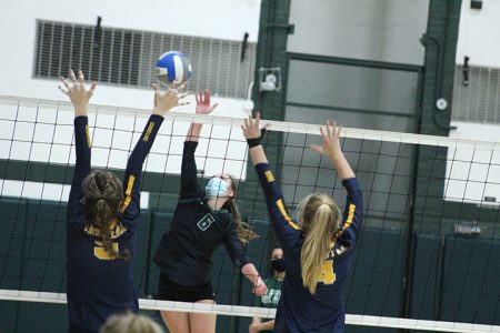 Alpena’s Kate Skiba (6) tries to spike a ball past Cadillac defenders Carissa Musta (9) and Madyson Smith (4) during the third set of a Big North Conference volleyball match on Wednesday at Alpena High School.