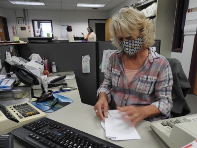 - News Photo by Crystal Nelson Debra Ross, deputy clerk with 88th District Court, on Wednesday stuffs an envelope with information about rental assistance programs.