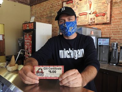 Downtown Scoops owner Aaron Buza holds a gift certificate, one of the incentives offered to encourage local drug court participants. Gift certificate sales support local shops, Buza said, “but, when it’s for a good cause, it’s even better.”