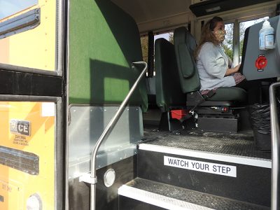 Annette Sauls, dispatcher at Alpena Public Schools, on Friday presses a button to close the school bus doors. Sauls has already had to drive a route this year when a substitute bus driver couldn’t be found.