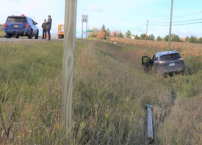 A Jeep that left M-32 west of Lachine Tuesday morning is seen after a two-vehicle collision that caused no injuries. The driver of the Jeep — a medical supply representative on his way to Traverse City — clipped a compact sedan as he was trying to merge back into traffic after passing a truck as all three vehicles traveled west. The Jeep careened off the road and into a ditch, taking one post of a two-legged sign with it. The front driver’s side of the Jeep and rear passenger side of the sedan sustained significant damage, but both drivers were checked by medical personnel and released.