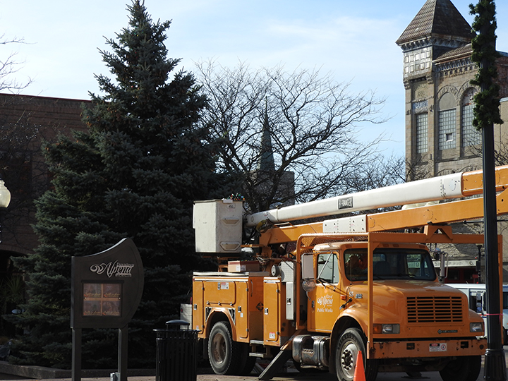 News Photo by Crystal Nelson The Alpena Christmas tree is erected on Friday in Culligan Plaza downtown. The 31-foot blue spruce was donated by Marty Skiba and family and will help bring cheer to city residents this holiday season, a city press release said.
