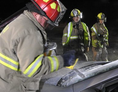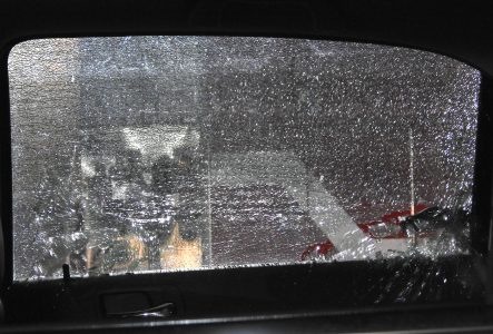 - News Photo by Julie Riddle Reacting to a blow from a firefighter, the glass window of a vehicle shatters at a training at the Alpena Township Fire Department north side station on Wednesday.