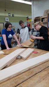 Students of the Geometry and Construction shop class at Alcona High School work on benches for Huron Pines. The students built 11 wooden benches for Huron Pines’ two nature preserves. Using lessons learned in their math class, students worked in groups to apply those concepts to their hands-on woodworking projects.