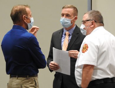 Alpena Township Supervisor Nathan Skibbe and Alpena Fire Department Chief Bill Forbush discuss logistics with Alpena Mayor Matt Waligora before a meeting at the APlex Tuesday night.