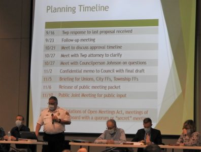 Alpena Fire Department Chief Bill Forbush explains the timeline for the development of a proposed merger between Alpena and Alpena Township’s fire departments during a presentation Tuesday night at the APlex.