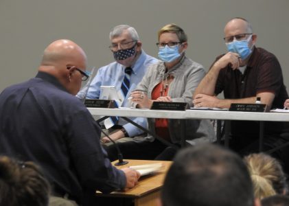 Alpena councilmen listen as Russ Rhynard speaks during the public comment section at a meeting Tuesday at the APlex.