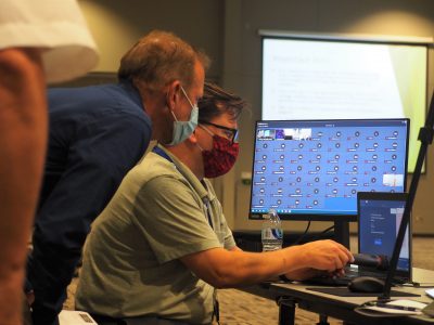 Alpena Mayor Matt Waligora supervises as a virtual attendee makes a public comment via computer speaker during an open meeting Tuesday regarding a proposed merger between the Alpena and Alpena Township fire departments.