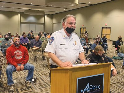 - News Photo by Julie Riddle Alpena Fire Department Chief Bill Forbush explains the timeline for the development of a proposed merger between Alpena and Alpena Township’s fire departments during a presentation Tuesday night at the APlex.
