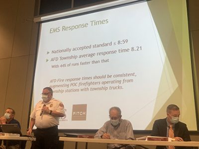 Alpena Fire Chief Bill Forbush used a slide show to help explain how a merger of the Alpena Township and Alpena Fire Department would operate. He said the city would benefit from having a large paid on-call first responders who can serve both the township and city, and the township would be able to utilize the city’s full staff of paramedics.