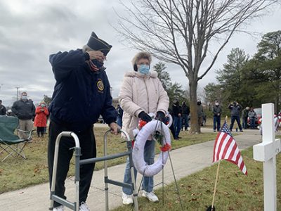 Tom and Jean Keen place a memorial wrench in front of the white-cross graves of local heroes who died during World War II. A wreath was placed in front of the monuments of those who were lost from all wars, as well as for the missing in action, Tomb of the Unknown Soldier, and to those impacted from Agent Orange.