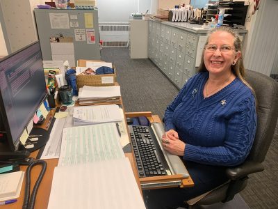 - News Photo by Steve Schulwitz Alpena Building Department Clerk Paddi LaCross is seen at her City Hall desk on Thursday.