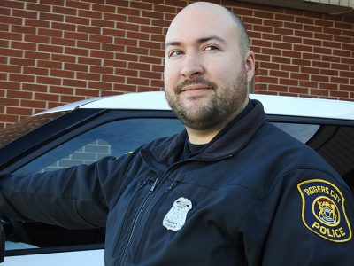- News Photo by Julie Riddle Officer Ryan Wisely shows off his once-a-year beard outside the Rogers City Police Department on Thursday.