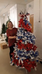 Besser Museum Education Coordinator Amanda Kucharek smiles for the camera as she puts the finishing touches on one of the trees in the 2020 Season of Light display.