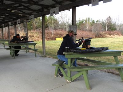 - News Photo by Crystal Nelson Patrick LaBrecque, of Flushing, front, and Tom Lancaster, of Gaylord, sight in their guns Friday at the Alpena Sportsmen’s Club.