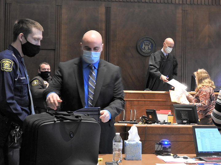 News Photo by Julie Riddle Police officers and court personnel prepare for the second half of a trial for John Gaddy in Alpena’s 26th Circuit Court today.