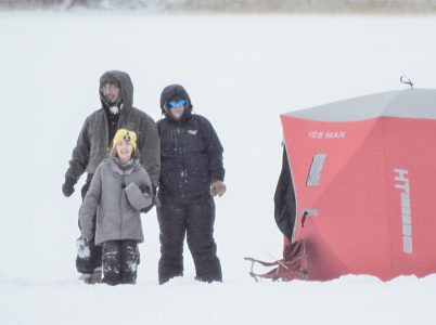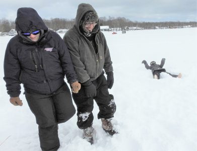 Daughter Arabella Nunez, 11, cheerfully declared the Valentine’s Day ice fishing outing to be “very cold” before scampering off to make an ice angel in the lake’s thick but soft snow cover.