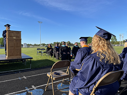News Photo by Crystal Nelson Alcona High School graduate Gabriel Froehner, one of the class's two valedictorians, addresses the Class of 2021 Friday in the high school’s football stadium. Hunter Winter was also valedictorian.