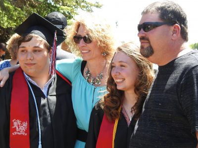After delivering flowers to loved ones in the packed bleachers of the school’s gym and accepting their diplomas one-by-one, the graduates turned their tassels and were ushered out of the gym to the strains of the school fight song. On the front lawn, confetti rained onto black gowns, parents hugged grinning grads, and 45 mortorboards were tossed into a blue graduation-day sky.