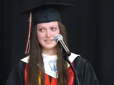 Honor student Keegan Hart, saying he would leave stirring speeches to the two students to speak after him, instead sang to his classmates an a capella rendition of in Irish song with the lyrics, “Come lift up your voices, all grief to refrain; For we may or might never all meet here again.”