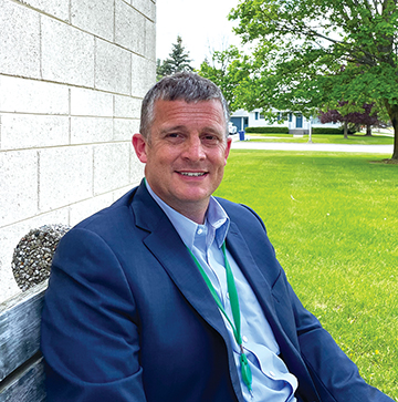 News Photo by Crystal Nelson Alpena Public Schools Superintendent Dave Rabbideau sits on a bench on May 26 outside Ella White Elementary School.