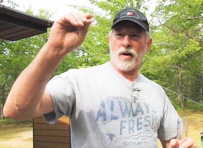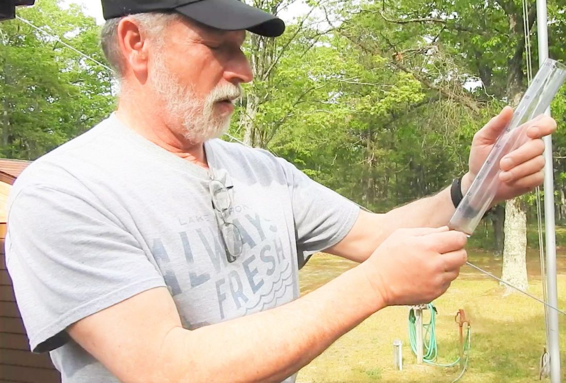 News Photo by Julie Riddle Trained storm spotter Mike Horn illustrates the sparse accumulation in a rain gauge outside his Rogers Township home on Monday.