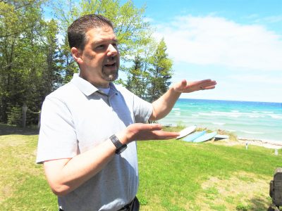 News Photo by Julie Riddle Pat Bak, warning coordination meteorologist with the National Weather Service in Gaylord, explains weather radar capabilities outside the 40 Mile Point Lighthouse north of Rogers City last month.
