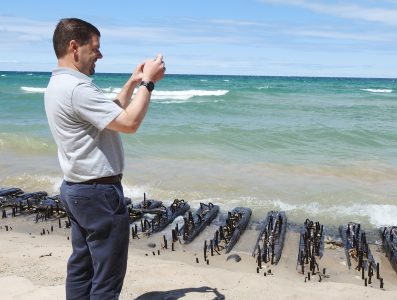 News Photo by Julie Riddle Pat Bak, warning coordination meteorologist with the National Weather Service in Gaylord, visits a shipwrecked portion of the Joseph S. Fay, buried in the sand near the 40 Mile Point Lighthouse north of Rogers City last month.