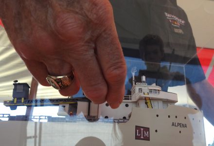 Lynn Laskowsky, of Mt. Pleasant, explains the process of creating a model boat, like his model of the freighter Alpena, displayed on Saturday at the Presque Isle Harbor Wooden Boat Show.