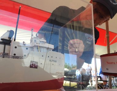 - News Photo by Julie Riddle A visitor admires a glass-encased model of the Alpena as Lynn Laskowsky, of Mt. Pleasant, explains the creative touches of the model — such as lock washers turned into life preservers — at the Presque Isle Harbor Wooden Boat Show on Saturday.
